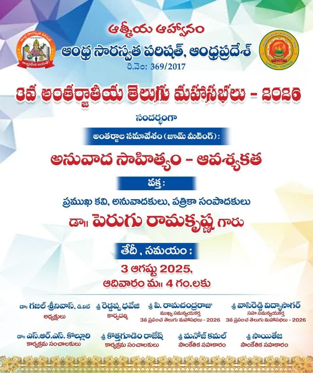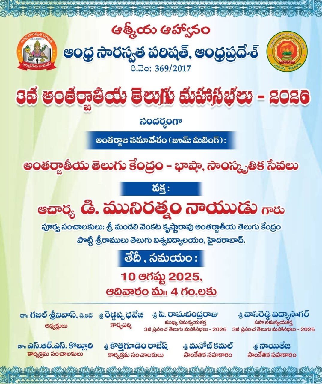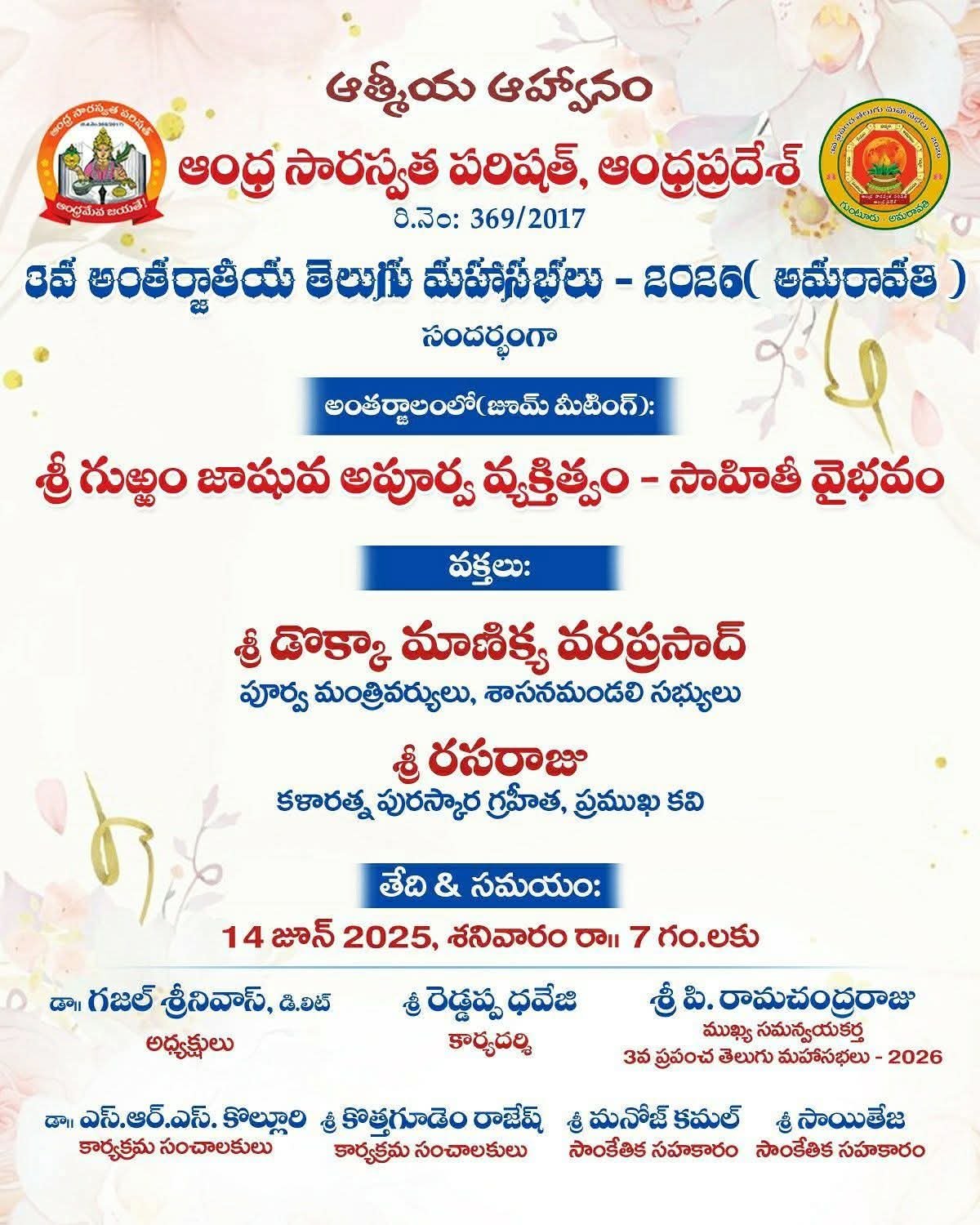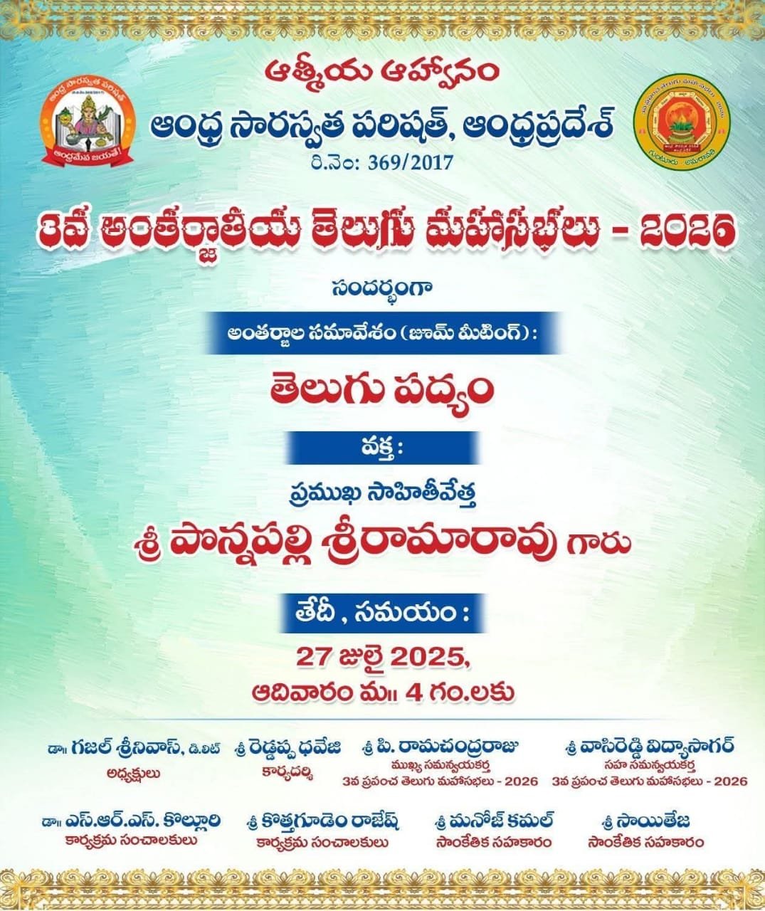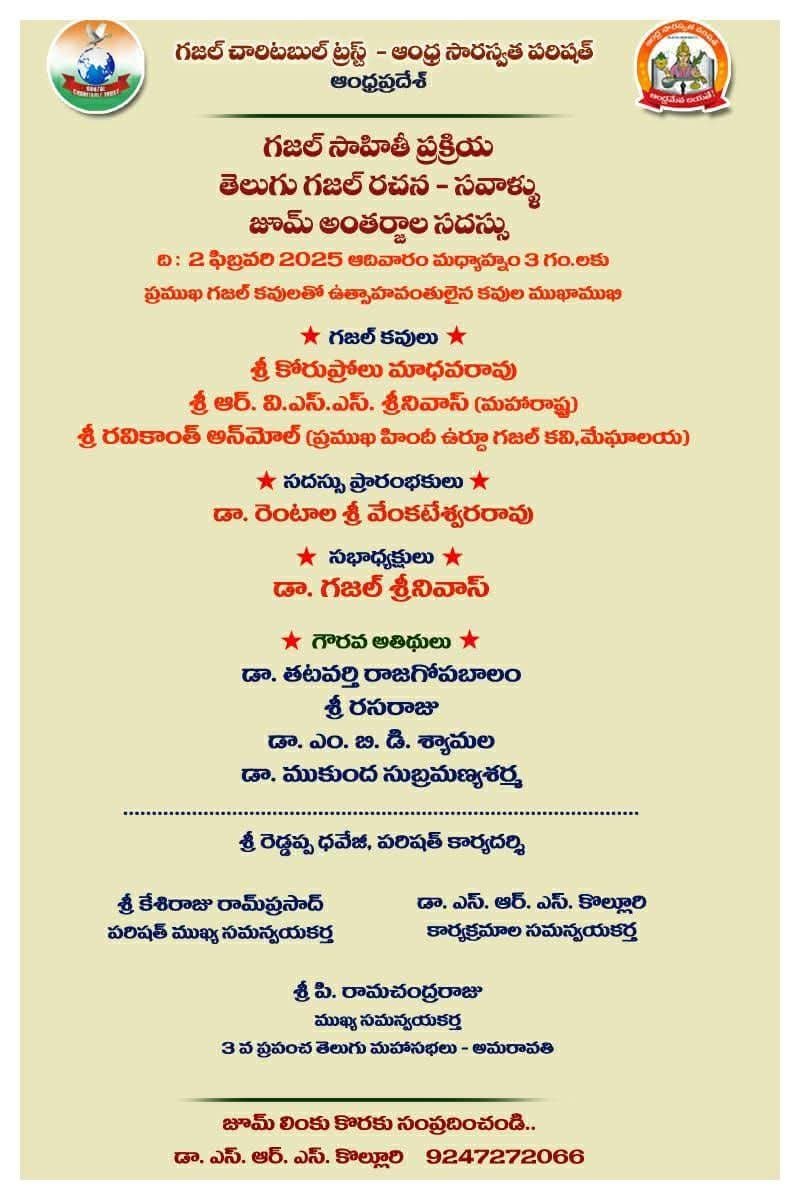 ప్రపంచ ప్రఖ్యాత గజల్ గాయకులు 3 సార్లు గిన్నిస్ బుక్ ఆఫ్ వరల్డ్ రికార్డ్ గ్రహీత, పెద్దలు, గౌరవ శ్రీ శ్రీ శ్రీ గజల్ శ్రీనివాస్ గారు అధ్యక్షతన జరుగుచున్న, 3వ ప్రపంచ తెలుగు...